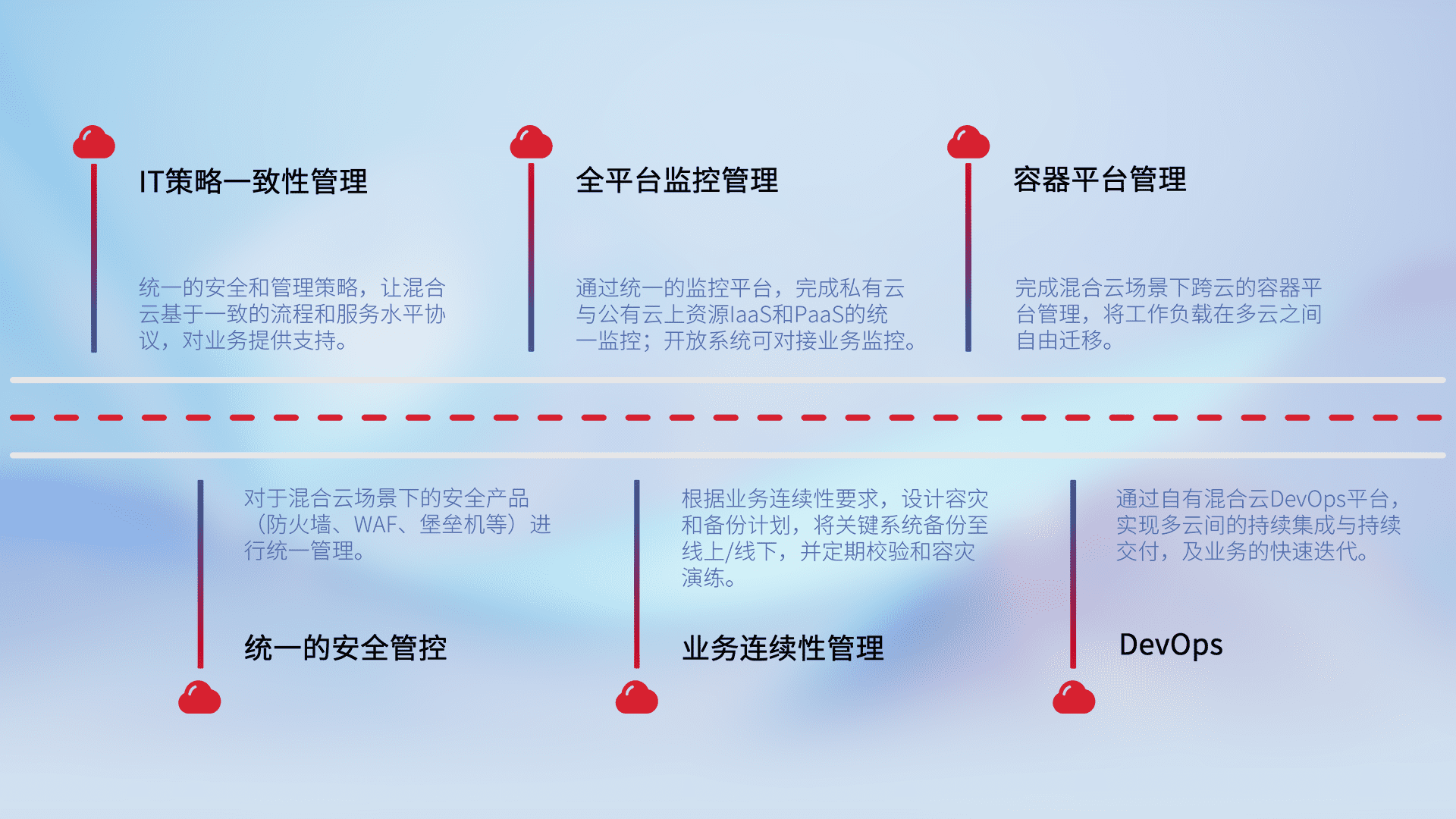 通过多云纳管,,,,以统一的资源数据模型把客户的云资源进行抽象和封装,,,进而实现对多云资源的统一操作,,,,保障云资源管理的可靠性、、稳定性与可用性。。。。量身定制化运维内容,,,,配置、、、开发运维、、、补丁管理、、备份、、监控、、认证和访问管理、、、、审计和日常巡检等,,,,保障在用云过程中的可靠度,,,,稳定度以及高可用率。。。