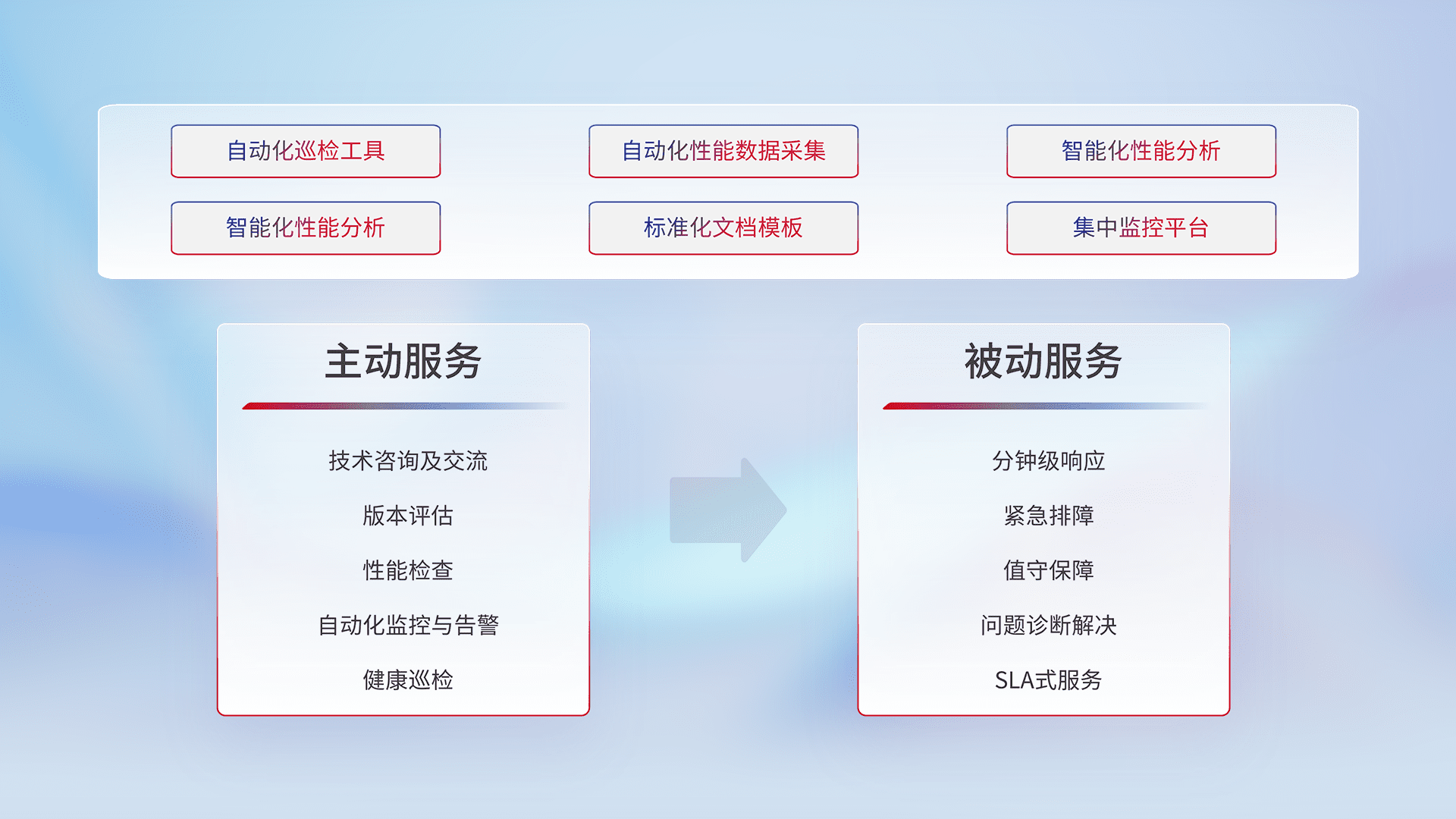 智能化工具和标准化文档,,,,保障服务质量,,提供主动服务(包含技术咨询、、、版本评估、、、性能检查、、、自动化监控与告警、、健康巡检)和被动服务包含(分钟级响应、、、、紧急排障、、、、值守保障、、、、问题诊断解决、、SLA服务)。。