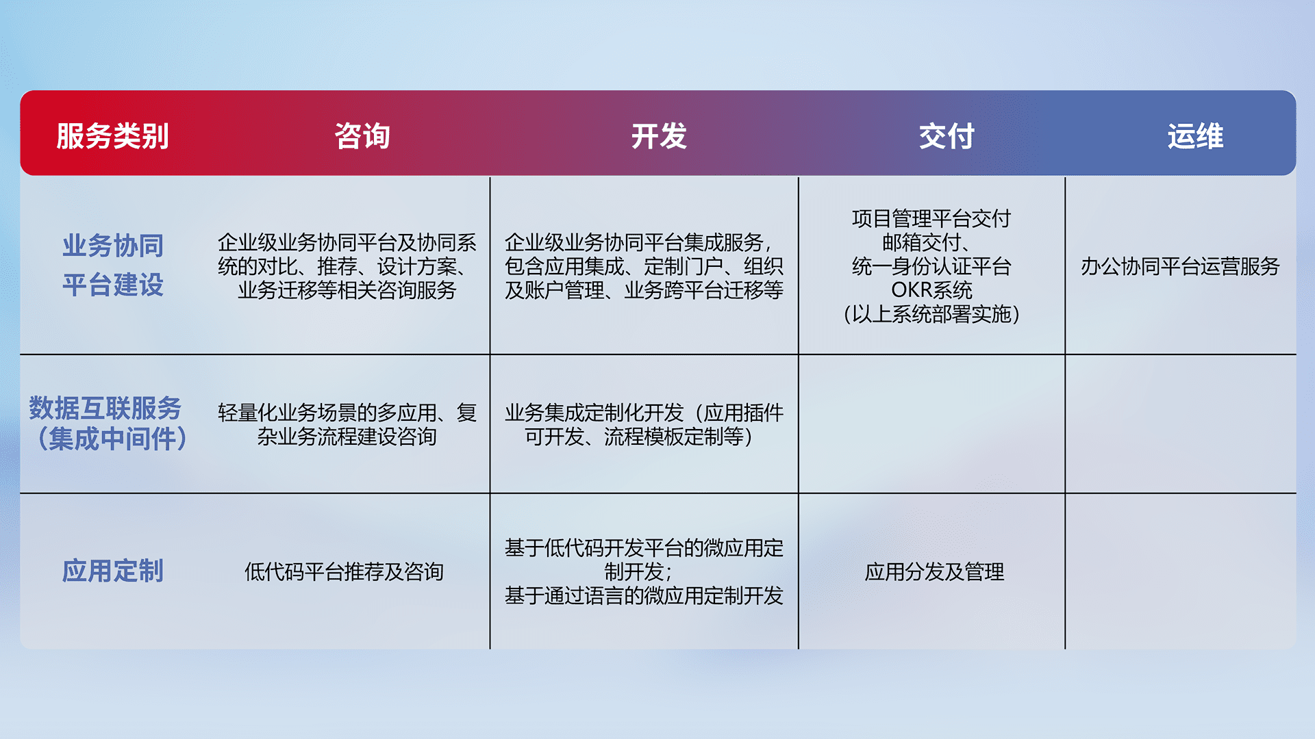 针对钉钉、、企微、、、IDaas等平台级产品提供产品的规划、、方案、、、、交付、、、、定制化开发等服务,,,,实现如统一协同办公、、、、智能客户服务、、、混合会议管理、、、智能数据查询、、、、等业务场景,,,实现数字化转型。。